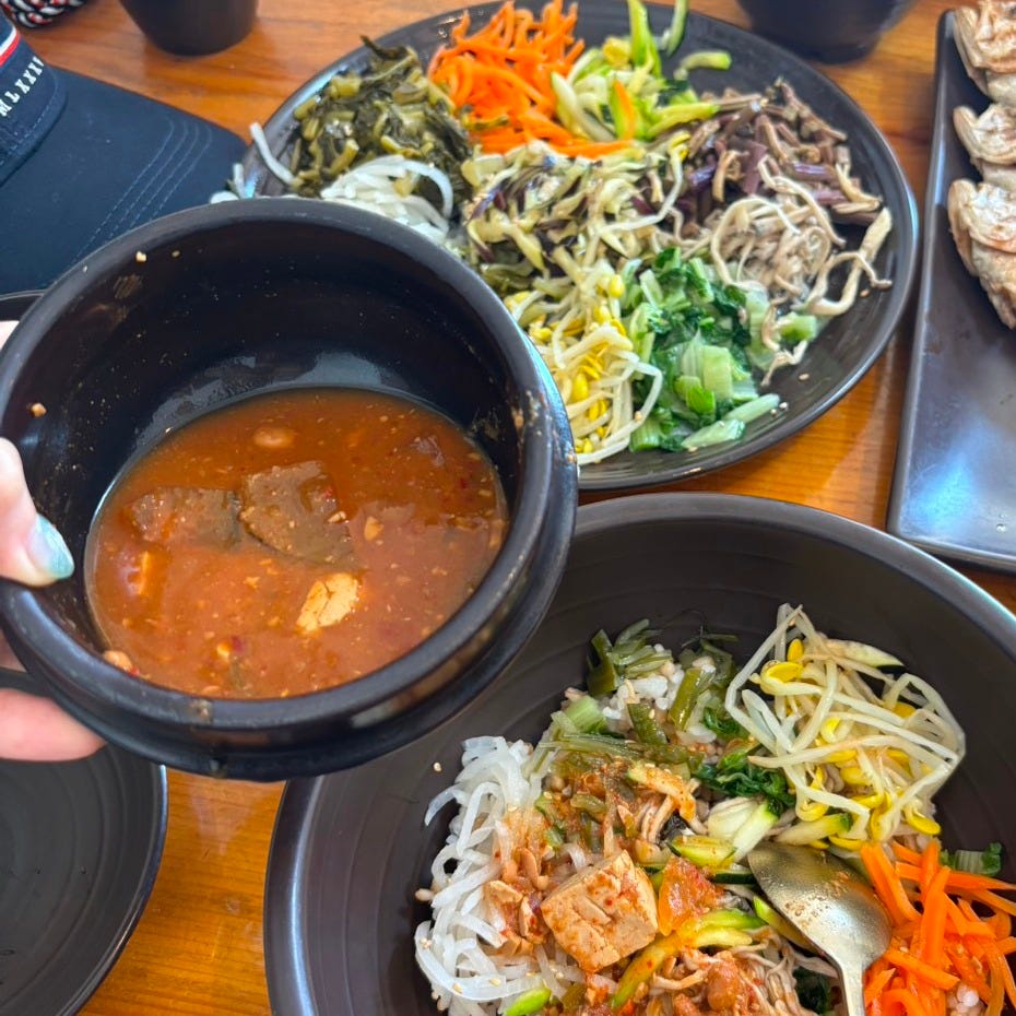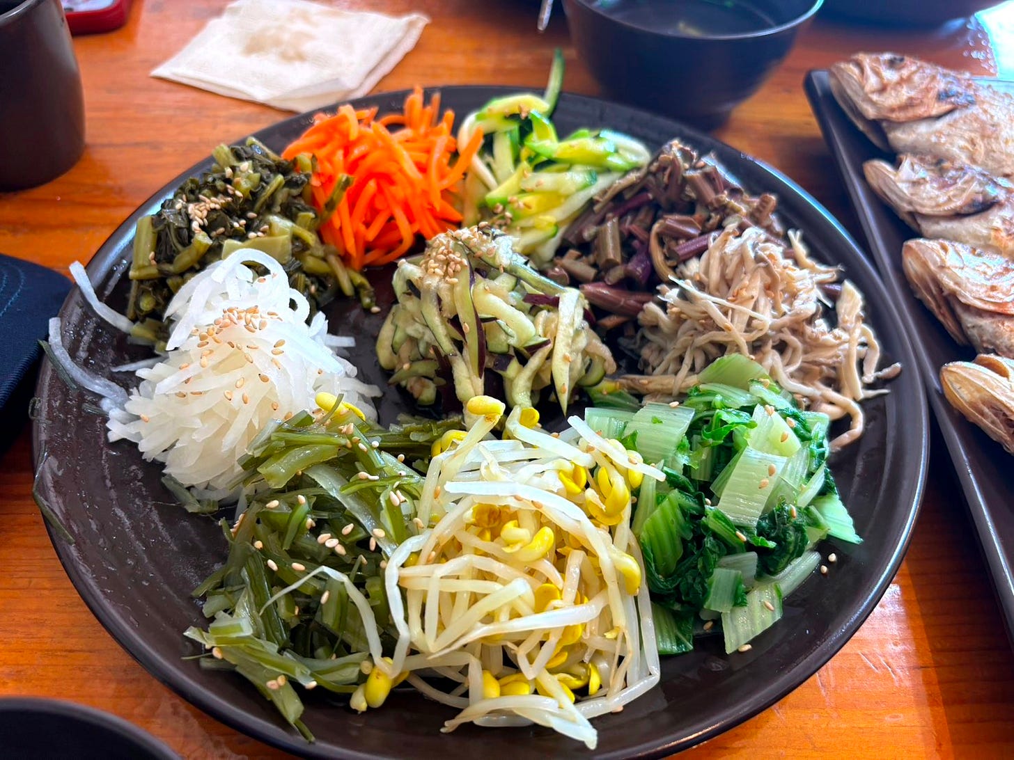 重頭戲是一大盤 9 種蔬菜,有海帶絲、豆芽菜、小黃瓜、白蘿蔔絲、紅蘿蔔絲等。